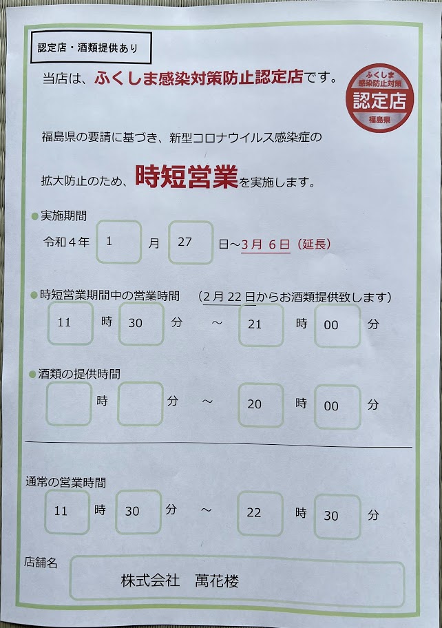 2月22日より営業時間を21時(お酒類の提供を20時)までとさせて頂きます