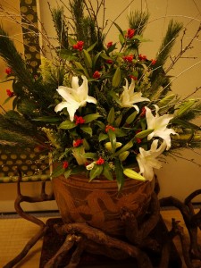 お正月に相応しい、松の木に千両、梅の木