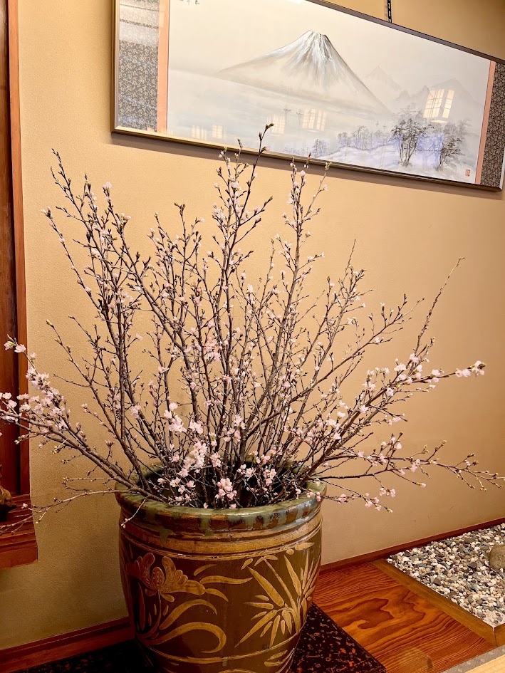 萬花楼のお部屋では大女将が生けた啓翁桜で
